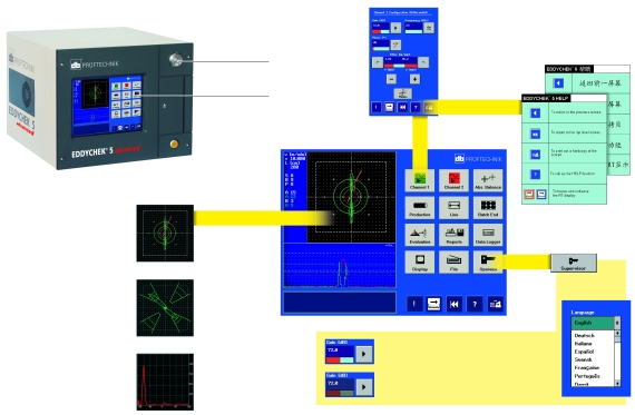●  視窗操作的方便性在視窗的屏幕,按下EDDYCHEK 5的圖標(biāo)就能打開用戶軟件。實時顯示探傷信號,渦流探傷的參數(shù)通過菜單模式調(diào)整,多種語言選擇。