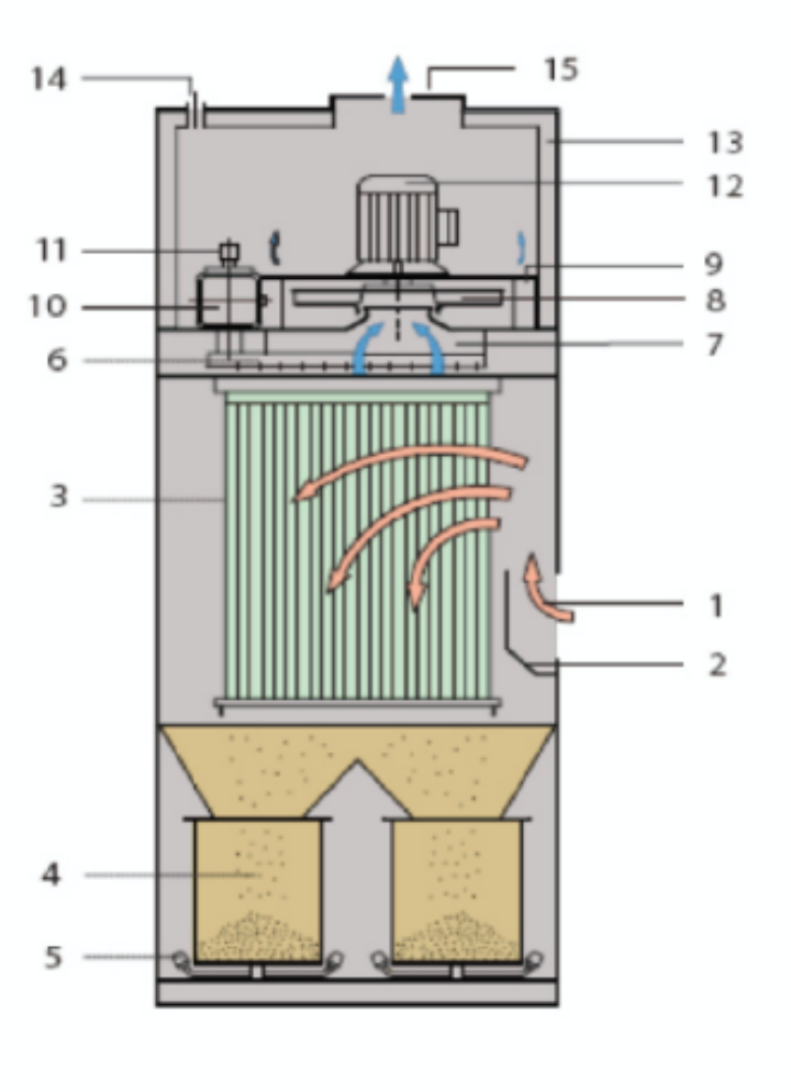 原氣(含塵氣體)通過進風口進入除塵設備,經過導流板后被減速并改向,此外還在各濾芯之間形成一個下沉式氣流,同時這還有助于粉塵的沉積,含塵氣體穿過濾芯后粉塵顆粒會被分離阻隔在濾芯表面。在整個 運行過程當中,可通過壓縮空氣脈沖反吹對粘附了粉塵的濾芯進行反吹清洗,反吹之后粉塵顆粒會沉降在灰桶 中,這部分粉塵可以回收利用。凈氣(過濾后的干凈空氣)自上部排出主機。